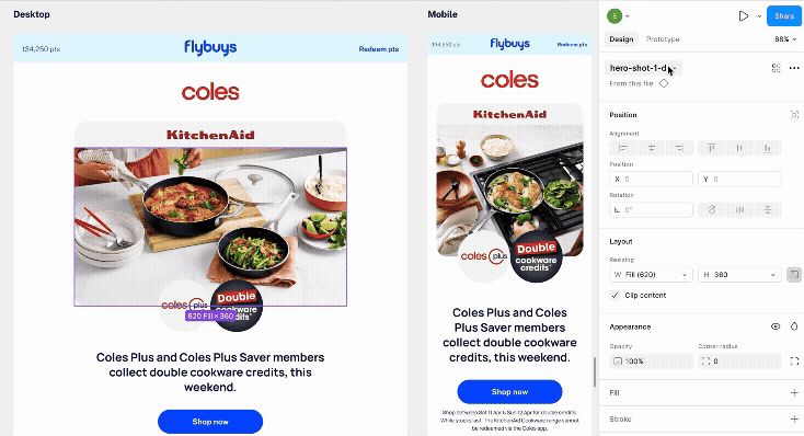 When the Flybuys eDM design moved in-house at Coles, the design team inherited a significant technical hurdle. While we had the visual layouts from the previous agency, the underlying Figma components remained linked to their private, external libraries. This created a "hollow" design environment where the internal team lacked the infrastructure to scale efficiently.