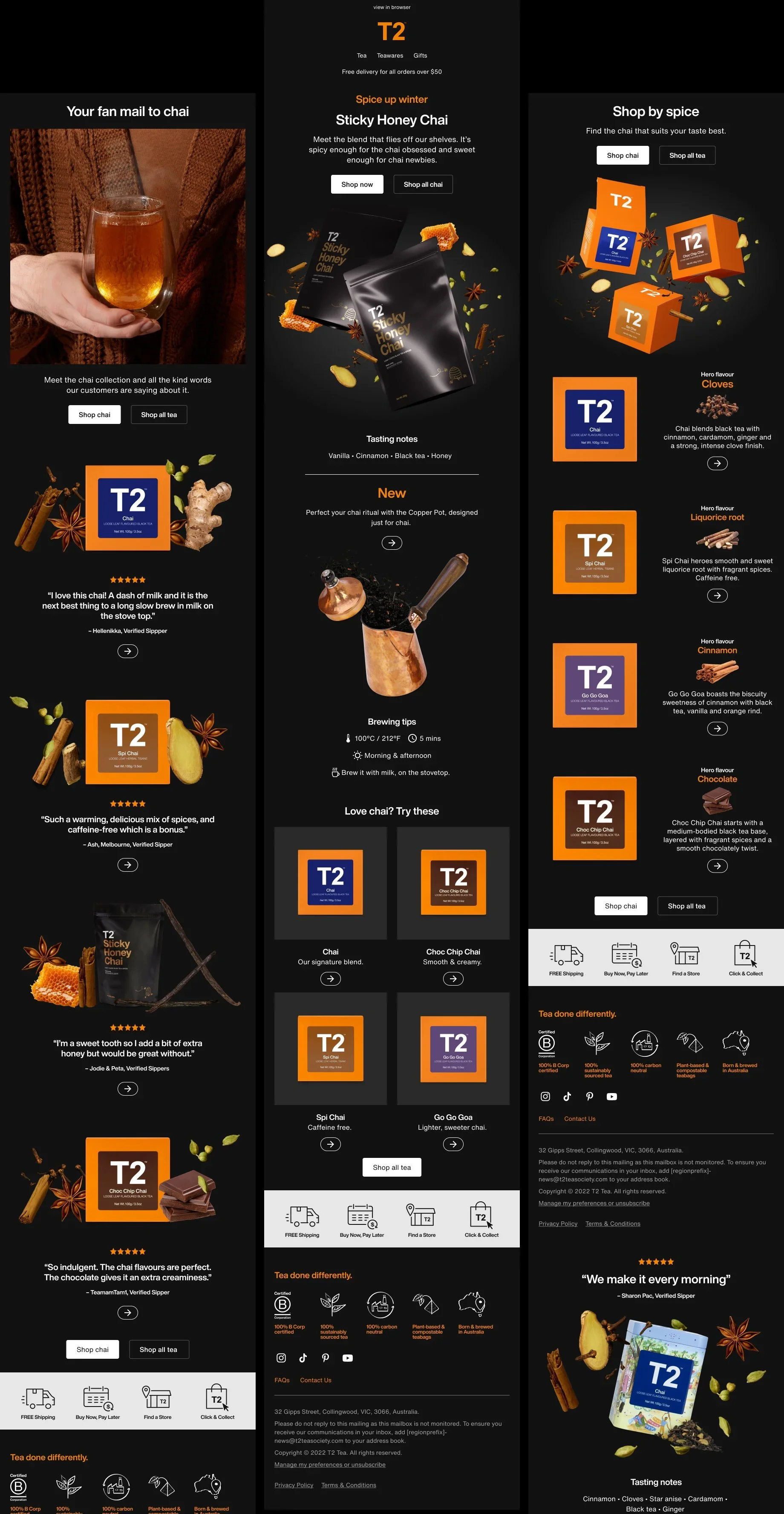 Designed campaign eDMs for T2’s email marketing, balancing the brand’s bold visual language with clarity, accessibility, and mobile-first readability. The layouts were structured to support promotional messaging and brand storytelling while maintaining consistency across T2’s broader digital ecosystem.
