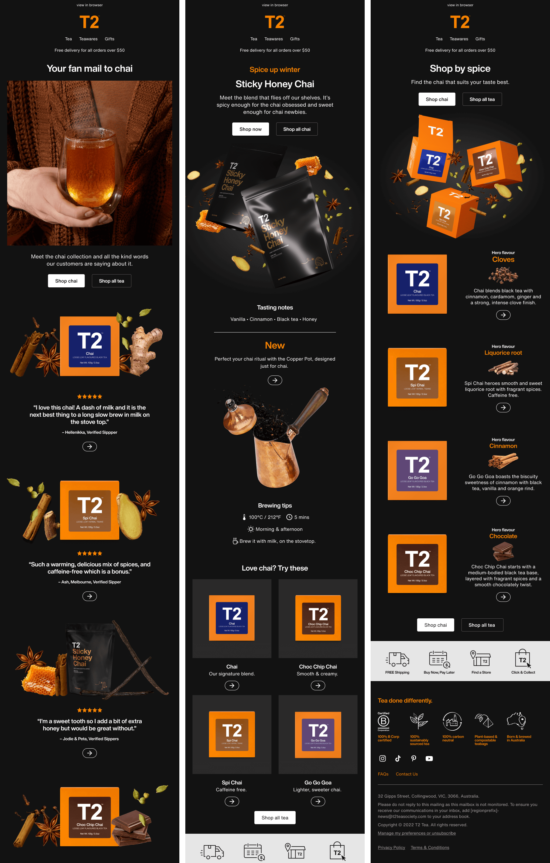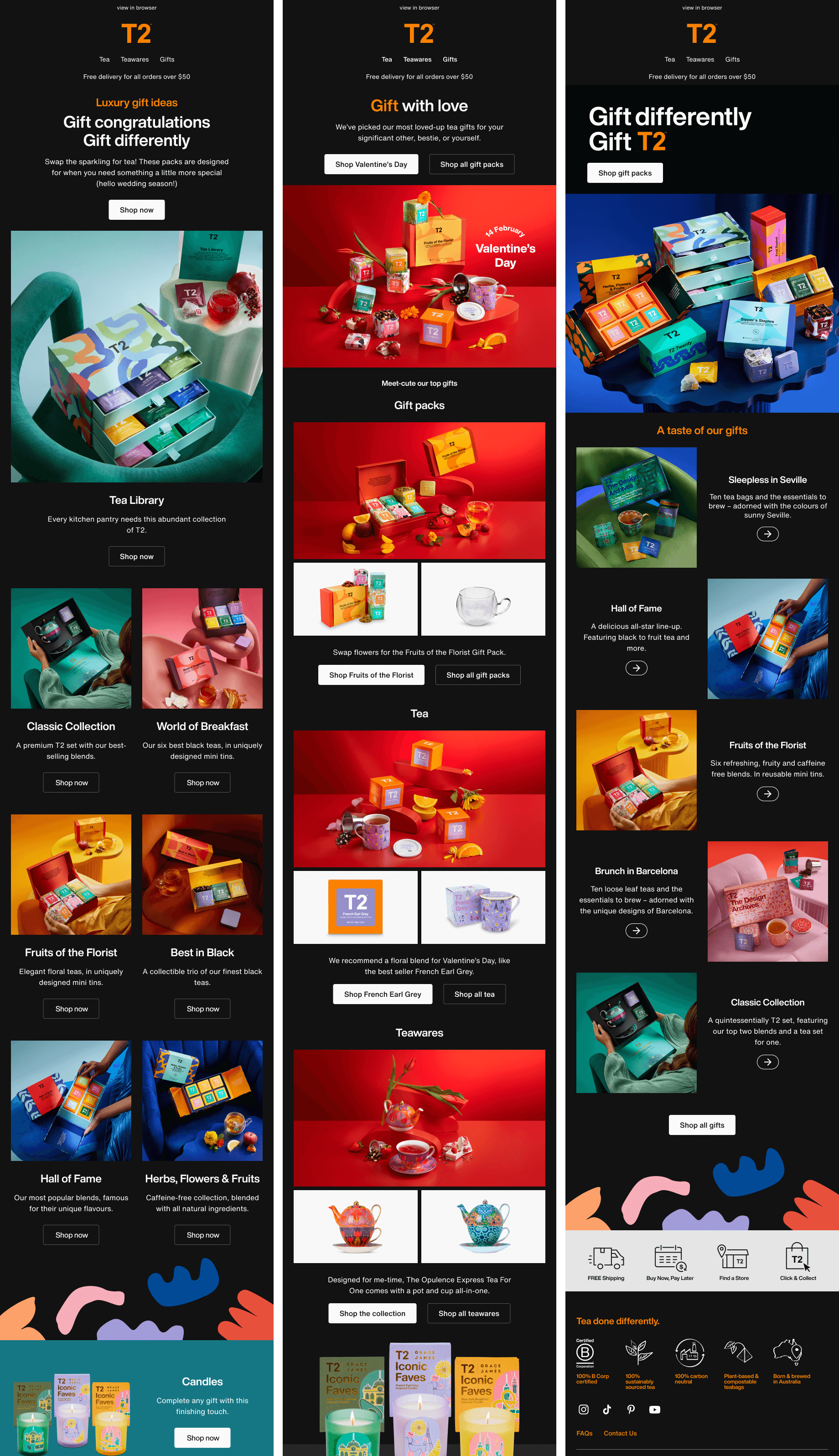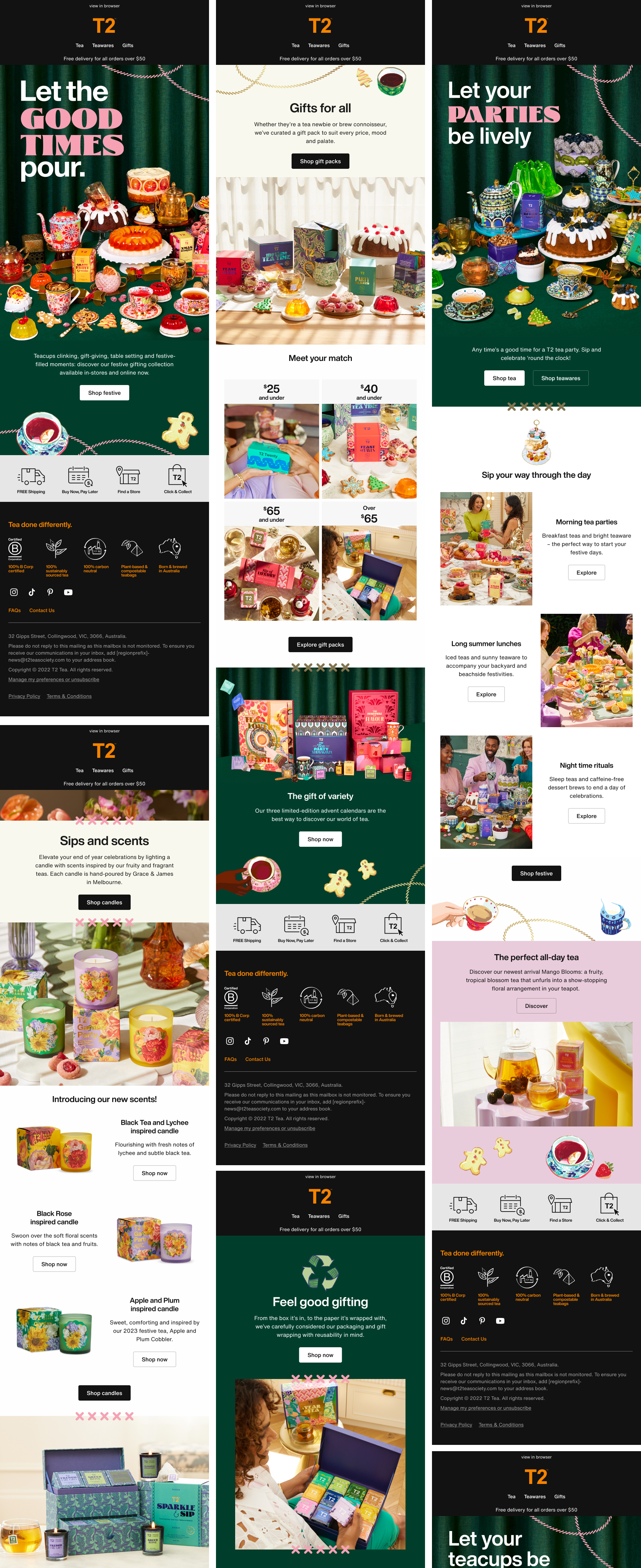 I designed these campaign eDMs by translating T2’s bold, maximalist visual language into high-impact digital experiences. While these examples showcase the expansive desktop layouts, each was developed as a responsive system to ensure brand integrity across the entire digital ecosystem.
